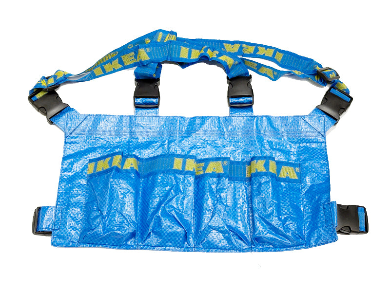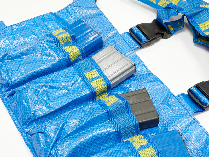 The [Idiot Tailor] M4 / AK Chest Rig is a unique and durable gear crafted from an iconic IKEA shopping bag. Designed to hold your essentials securely, this chest rig combines practicality with a bold, recognizable style. Its lightweight and sturdy material ensures comfort and lasting use during your activities. Perfect for those who appreciate functional fashion with a creative twist.