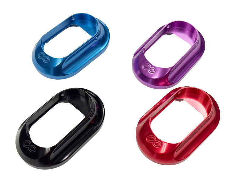 Precision-engineered aluminum XL Infinity Magwell specifically designed for CNC Hi-Capa grips. This Purple-finished component enhances reload speed and accuracy by providing a wider funnel for magazine insertion. Manufactured from high-grade aluminum for optimal durability while maintaining minimal weight. Essential upgrade for competitive shooters seeking improved handling characteristics and performance reliability.