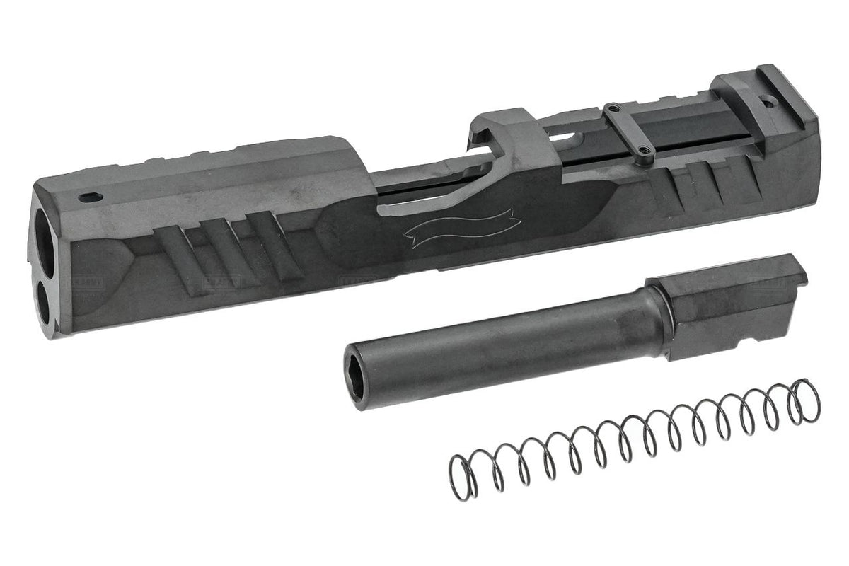This [Pro Arms] Stainless Steel Slide and Outer Barrel Set is designed for the VFC Walther PDP GBB Series, offering enhanced durability thanks to its robust stainless steel construction and DLC surface coating. It includes an improved recoil spring to provide a more realistic recoil sensation, making your shooting experience more satisfying and reliable. Compatible specifically with the Umarex VFC Walther PDP GBBP, this set ensures a precise fit and long-lasting performance. Ideal for upgrading your airsoft pistol with strength and consistent function.