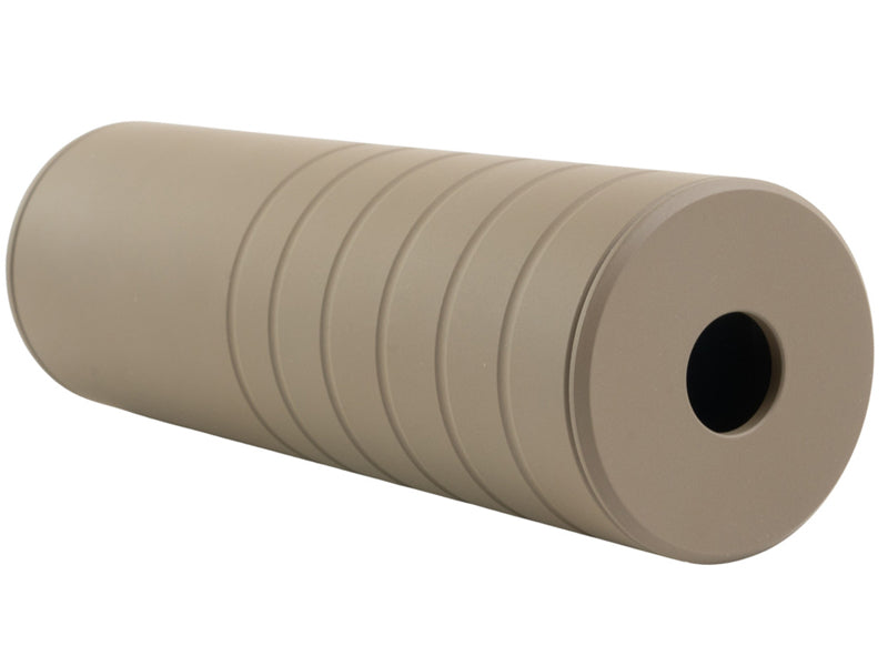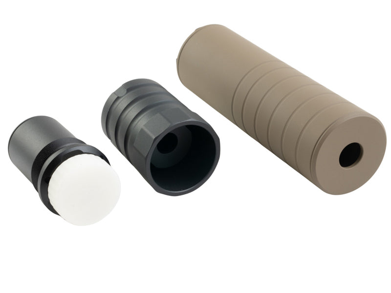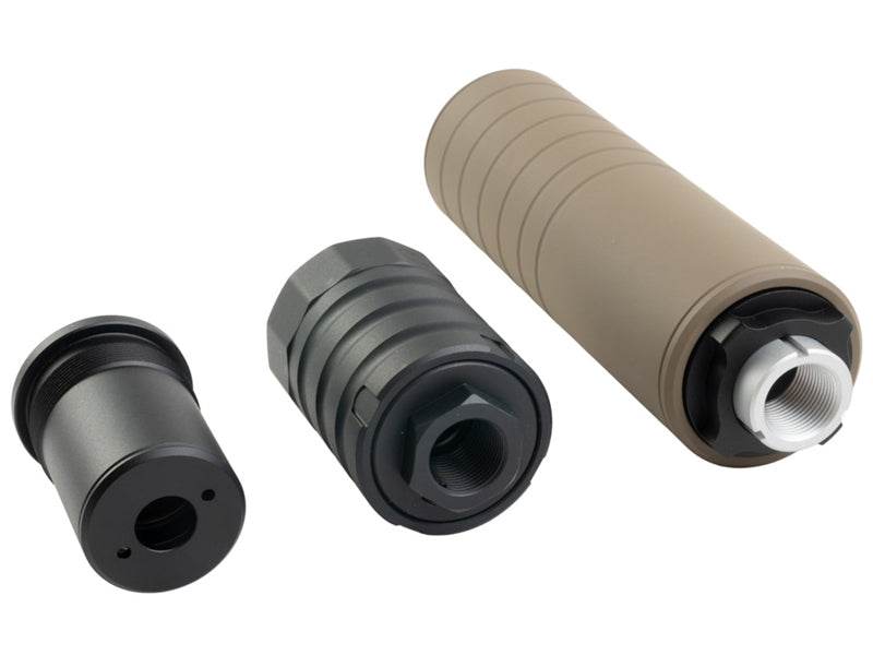 • This mock suppressor by RGW is high-quality replica of the Omega 9K Pistol/PDW 9mm suppressor. Featuring a CNC aluminum construction and topped off with a Tan/DE Cerakote finish for the suppressor unit and a CNC steel J-Mac-style muzzle break and muzzle blast guard, this whole suppressor set is built to the utmost quality in terms of durability and aesthetics. The suppressor unit features highly detailed roll marks and markings, further adding to its overall aesthetics. The Omega 9K suppressor unit by RGW comes with a CNC aluminum direct thread adapter that allows the suppressor to be mounting directly onto the barrel, a CNC aluminum Tri-lug adapter for barrels outfitted with a Tri-lug attachment system, and a CNC steel J-Mac micro muzzle break that can mount onto the suppressor base directly or covered with a muzzle blast guard that is also made of CNC steel. This mock suppressor set allows the end-user to customize and set up this suppressor to their preferences with ease. It is a simple installation process and does not require modifications to ensure proper fitment.