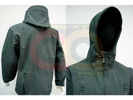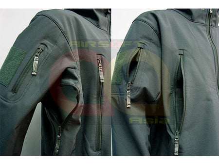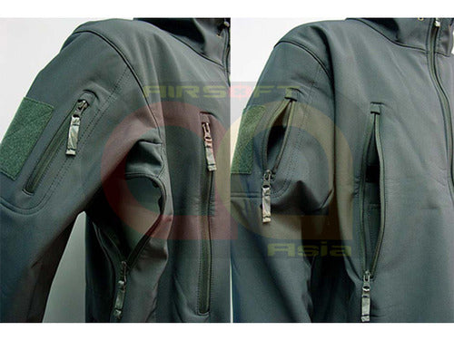 Shark skin soft shell fabric with warm inner fleece.