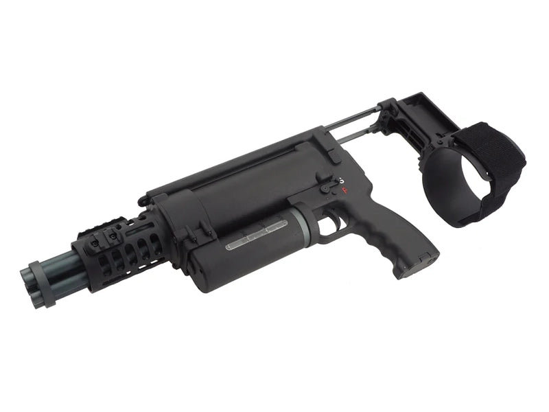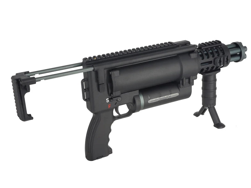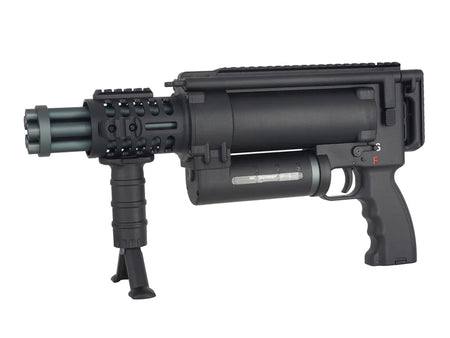 Experience the ultimate firepower with the [WELL Pro] Compact Rotary Airsoft AEG LMG Minigun. This five barrel gatling type machine gun boasts an impressive rate of fire of 40 rounds per second. With an arm brace, M-Lok forearm, and 600 round magazine, dominate the battlefield with ease and precision.